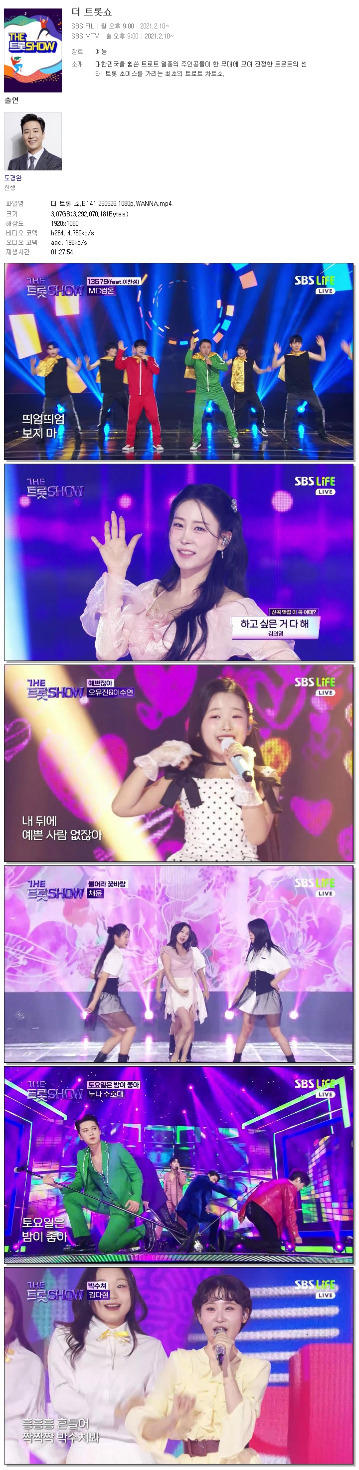 | [SBS LIFE] 더 트롯 쇼.E141.250526.1080p.WANNA[박지현, 안성훈].mp4 | 3.1 G | 01:27:54 | 1920x1080 |