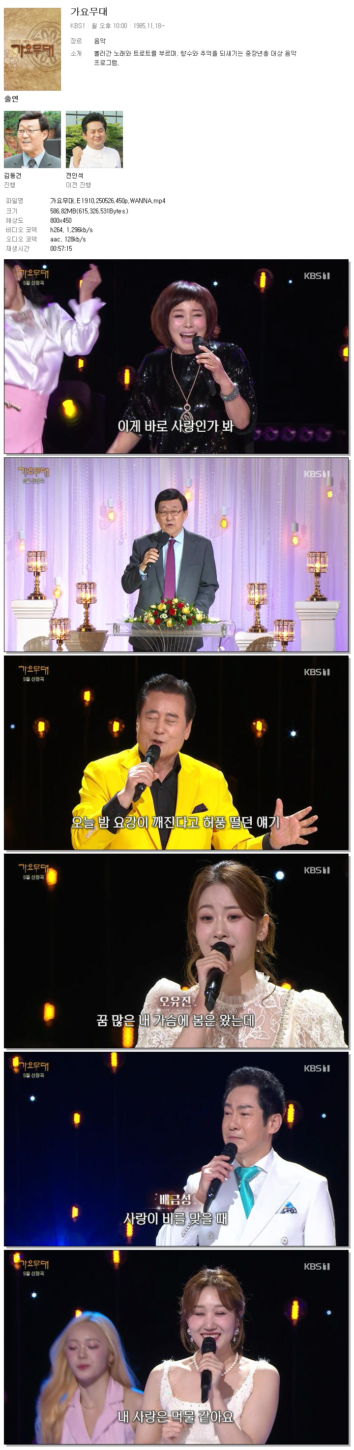 | [KBS1] 가요무대.E1910.250526.450p.WANNA[현숙, 김유라].mp4 | 586.8 M | 00:57:15 | 800x450 |