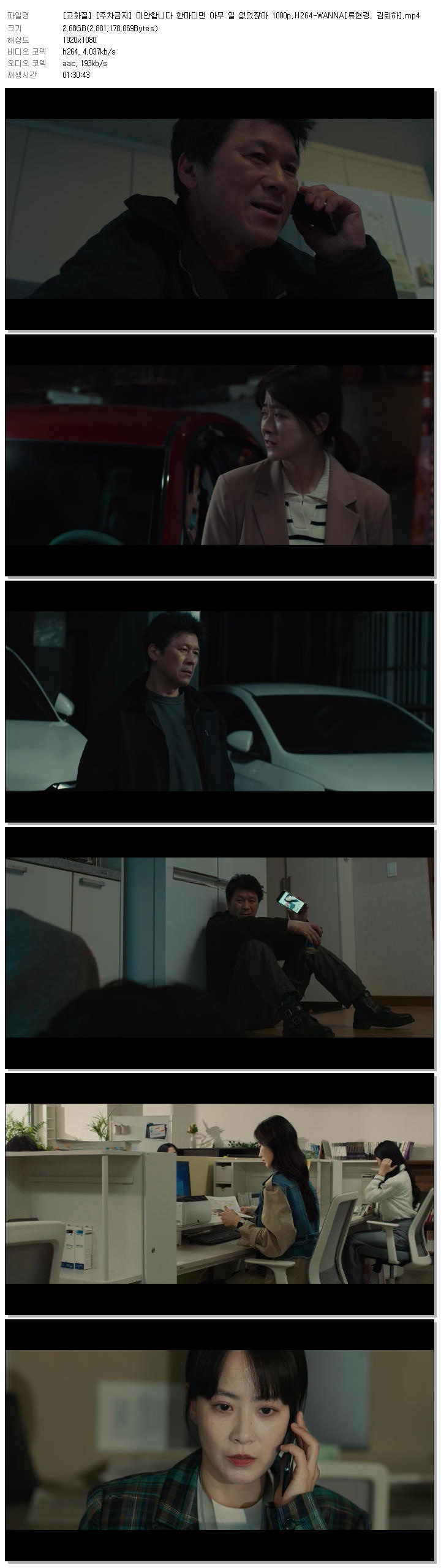 | [고화질] [주차금지] 미안합니다 한마디면 아무 일 없었잖아 1080p.H264-WANNA[류현경, 김뢰하].mp4 | 2.7 G | 01:30:43 | 1920x1080 |
