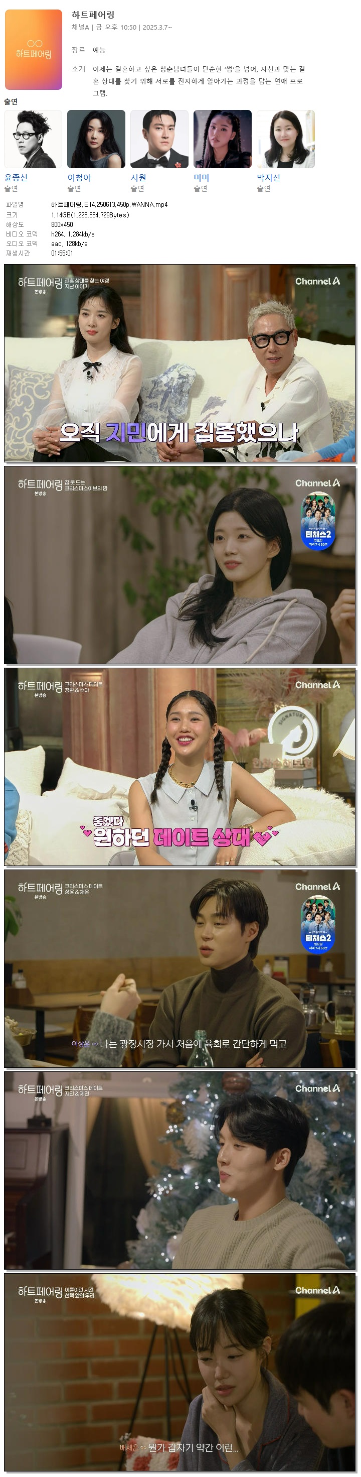 | [채널A] 하트페어링.E14.250613.450p.WANNA[윤종신, 이청아].mp4 | 1.1 G | 01:55:01 | 800x450 |