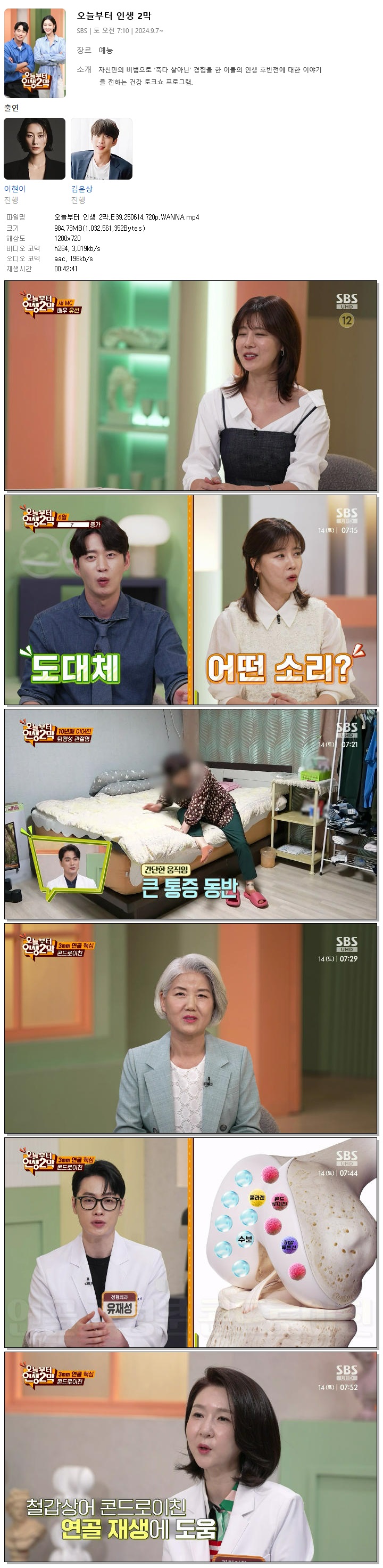 | [SBS] 오늘부터 인생 2막.E39.250614.720p.WANNA[이현이, 김윤상].mp4 | 984.7 M | 00:42:41 | 1280x720 |