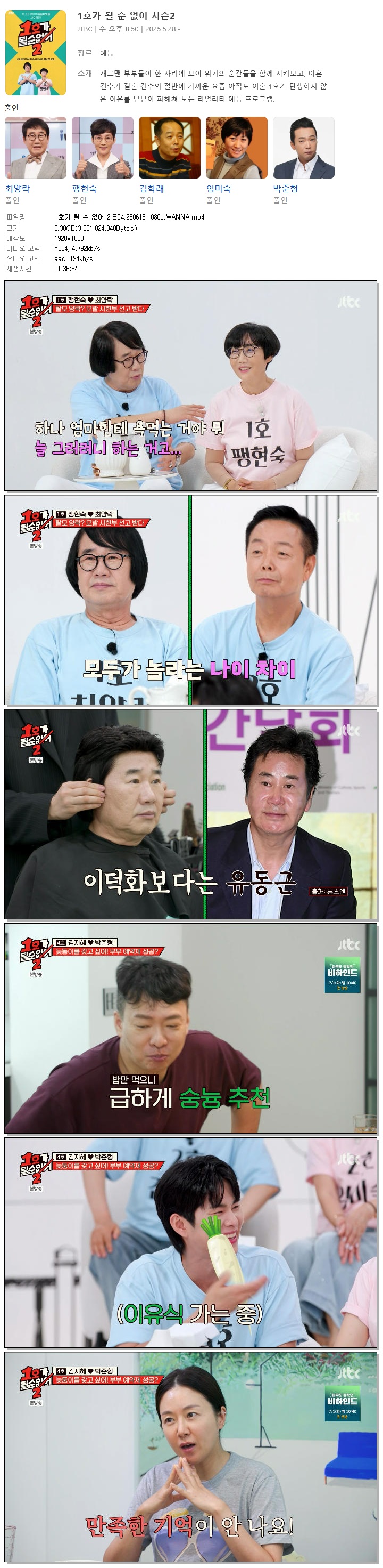 | [JTBC] 1호가 될 순 없어 2.E04.250618.1080p.WANNA[박준형, 이지혜].mp4 | 3.4 G | 01:36:54 | 1920x1080 |