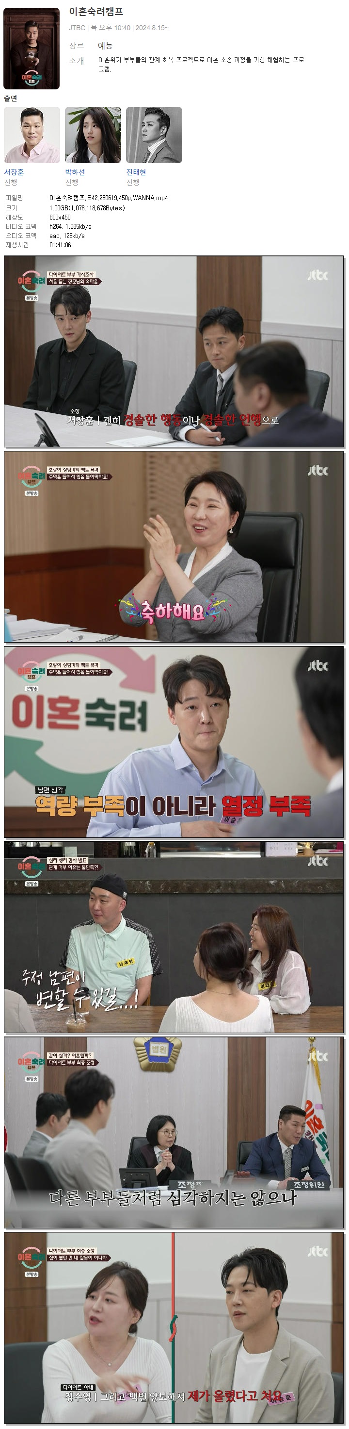 | [JTBC] 이혼숙려캠프.E42.250619.450p.WANNA[서장훈, 박하선].mp4 | 1 G | 01:41:06 | 800x450 |