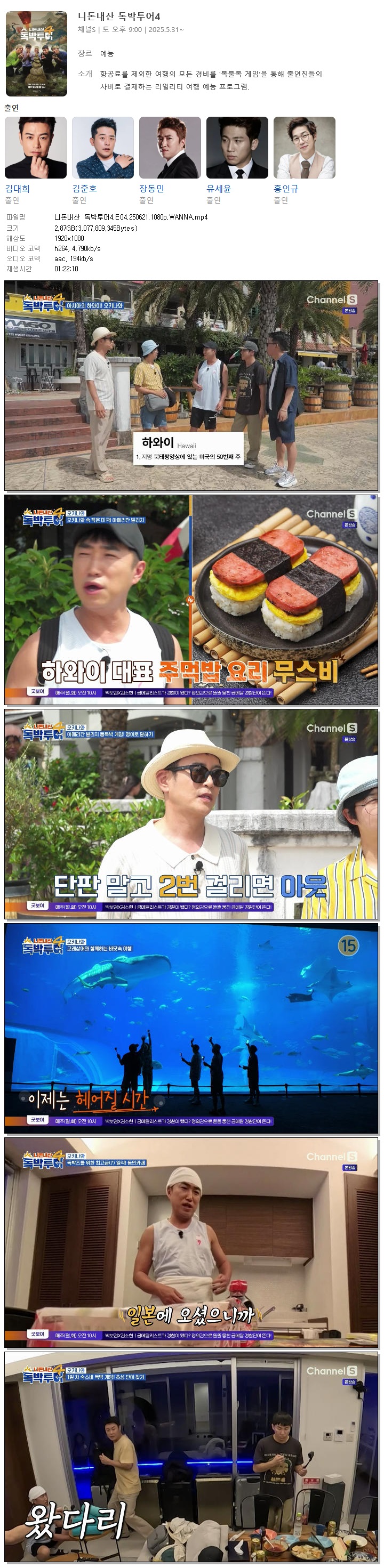 | [채널S] 니돈내산 독박투어4.E04.250621.1080p.WANNA[김준호, 장동민].mp4 | 2.9 G | 01:22:10 | 1920x1080 |