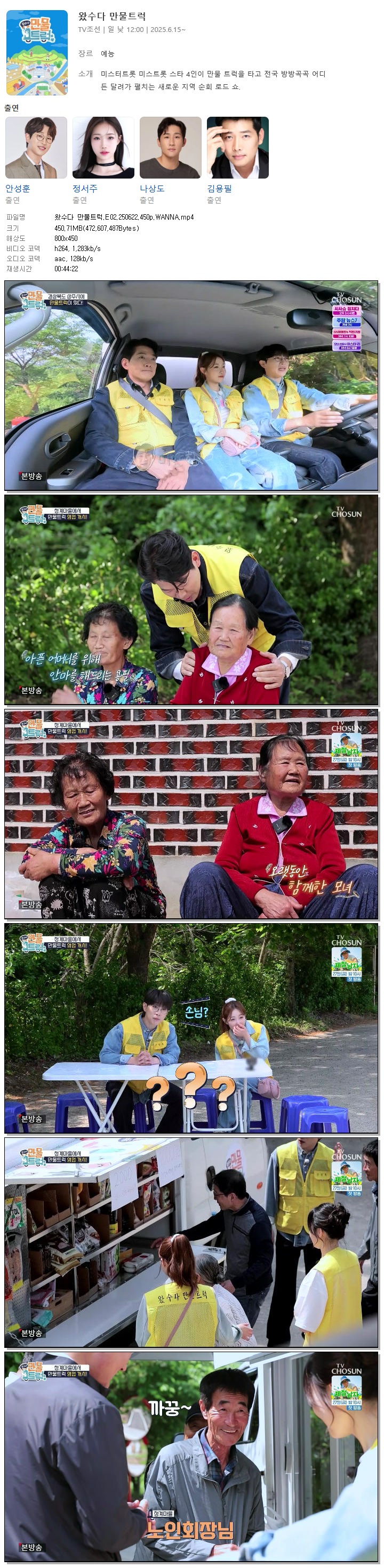 | [TV조선] 왔수다 만물트럭.E02.250622.450p.WANNA[안성훈, 정서주].mp4 | 450.7 M | 00:44:22 | 800x450 |