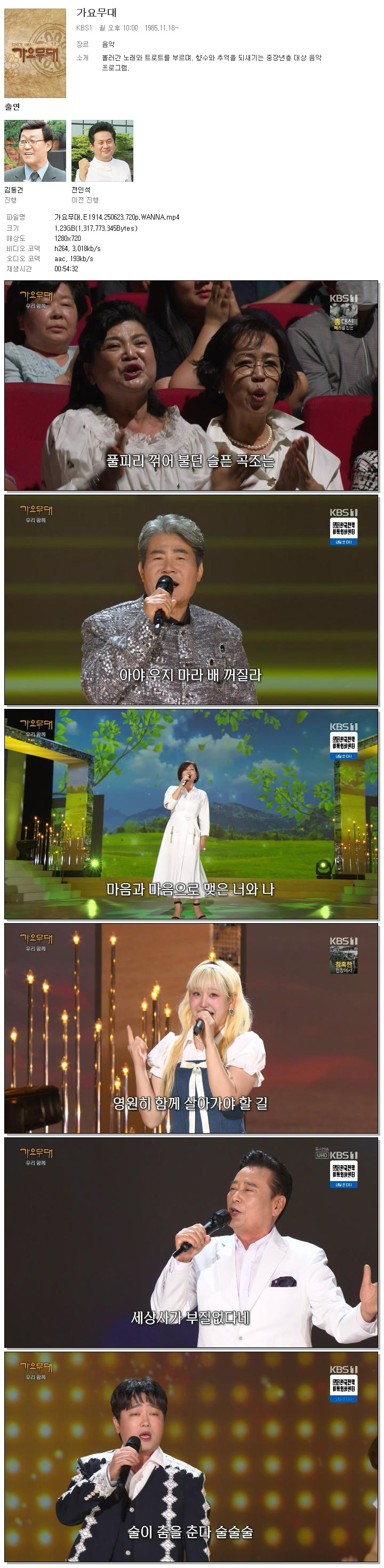 | [KBS1] 가요무대.E1914.250623.720p.WANNA[진성, 이부영].mp4 | 1.2 G | 00:54:32 | 1280x720 |