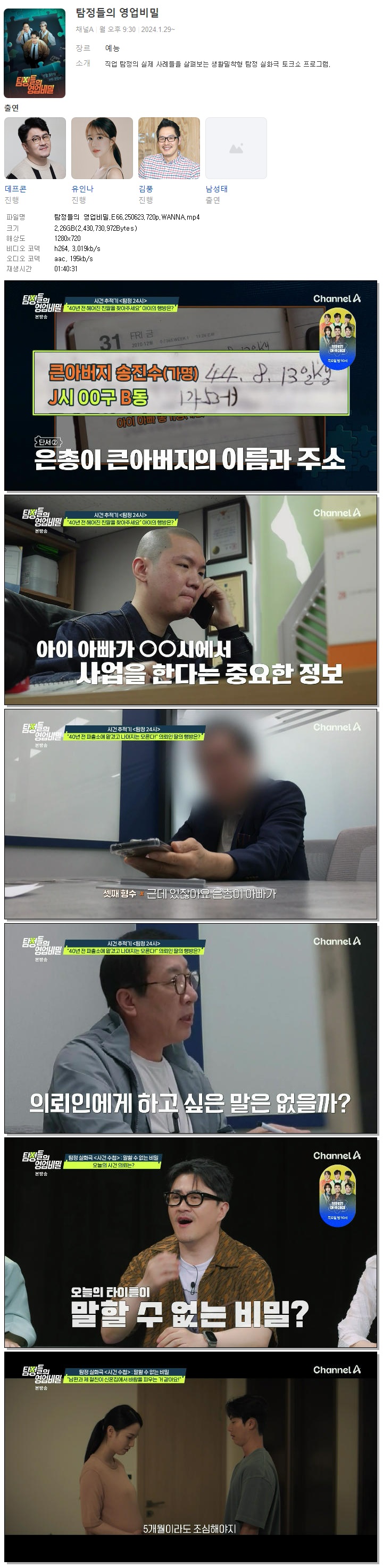 | [채널A] 탐정들의 영업비밀.E66.250623.720p.WANNA[강지영].mp4 | 2.3 G | 01:40:31 | 1280x720 |