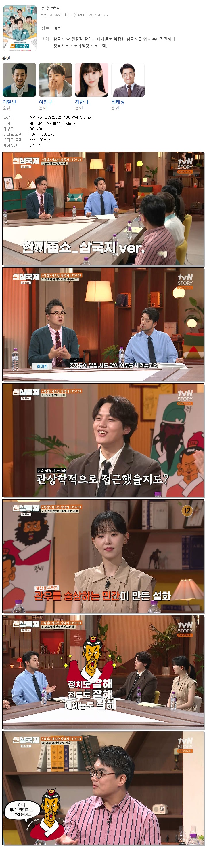 | [TVN STORY] 신삼국지.E09.250624.450p.WANNA[침착맨, 여진구].mp4 | 762.4 M | 01:14:41 | 800x450 |