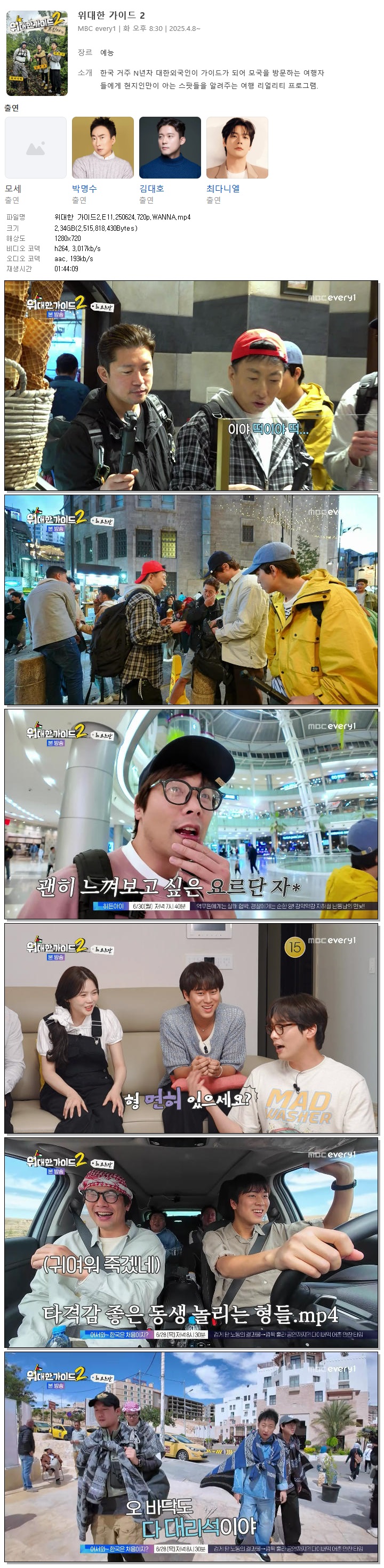 | [MBC Every1] 위대한 가이드2.E11.250624.720p.WANNA[박명수, 최다니엘].mp4 | 2.3 G | 01:44:09 | 1280x720 |