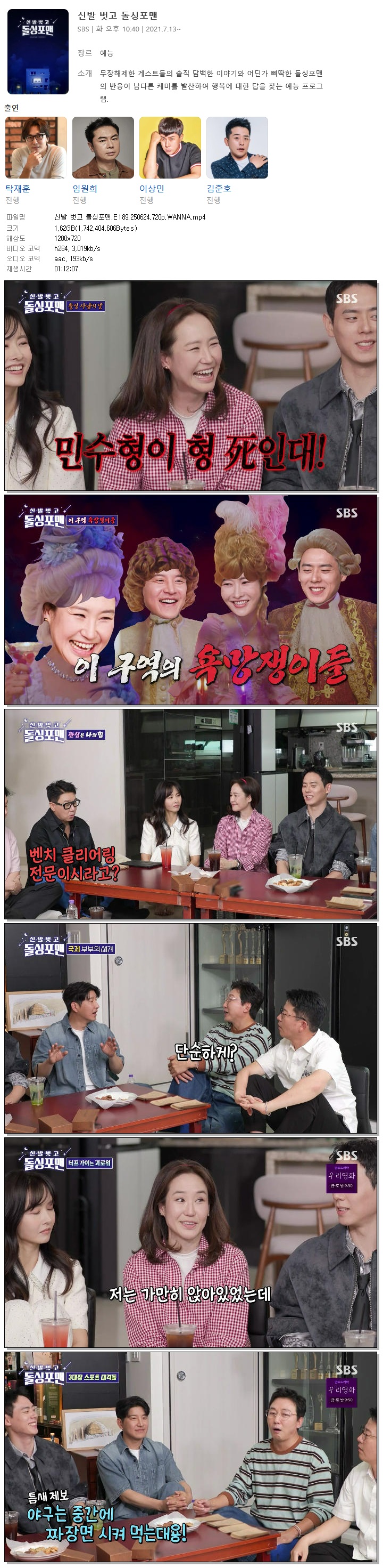 | [SBS] 신발 벗고 돌싱포맨.E189.250624.720p.WANNA[강주은, 이관희].mp4 | 1.6 G | 01:12:07 | 1280x720 |