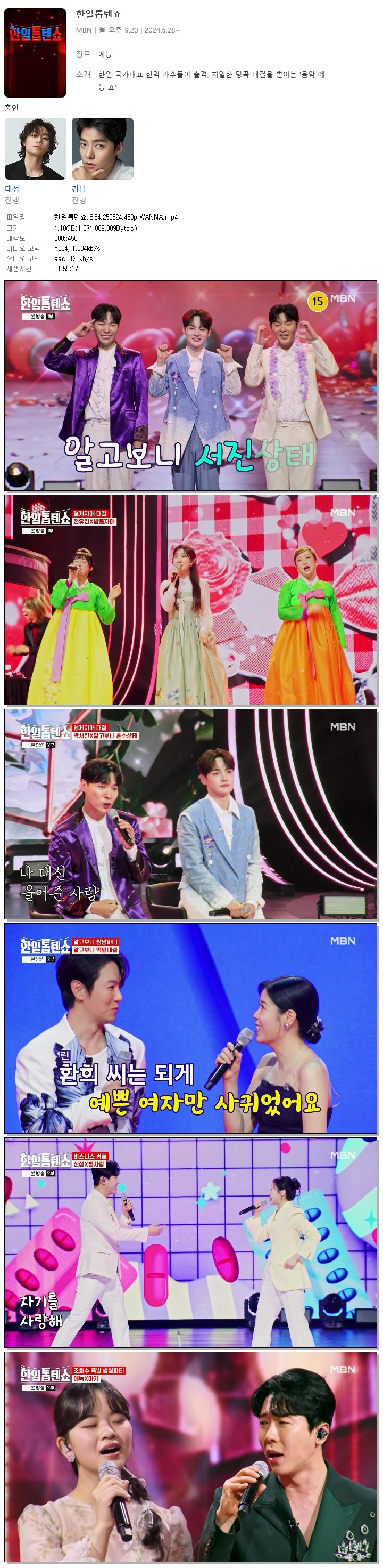 [MBN] 한일톱텐쇼.E54.250624.450p.WANNA[정경미, 김미려].mp4 1.2 G 01:59:17 800x450