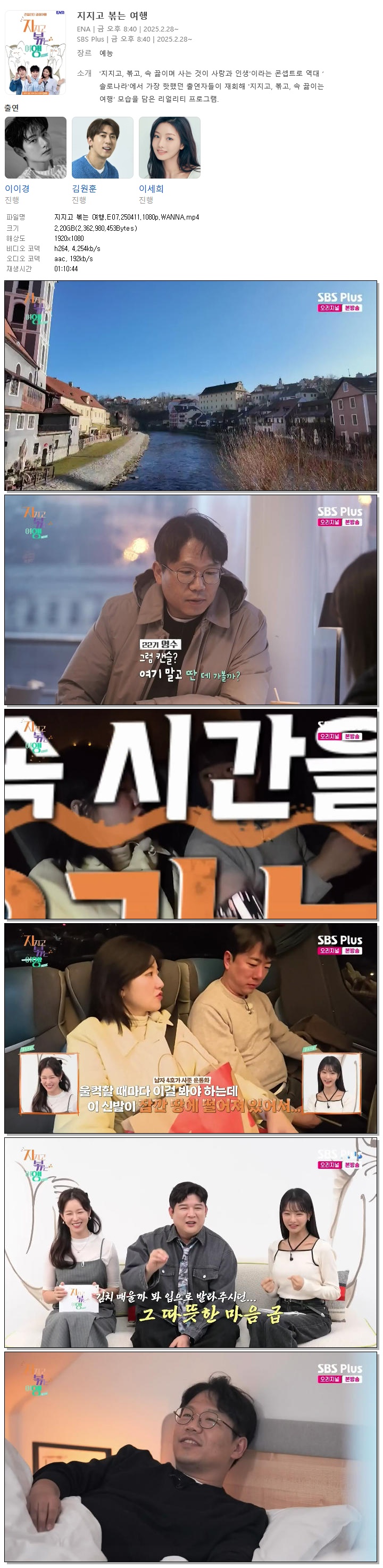 | [SBS PLUS] 지지고 볶는 여행.E07.250411.1080p.WANNA[신동, 경수진].mp4 | 2.2 G | 01:10:44 | 1920x1080 |