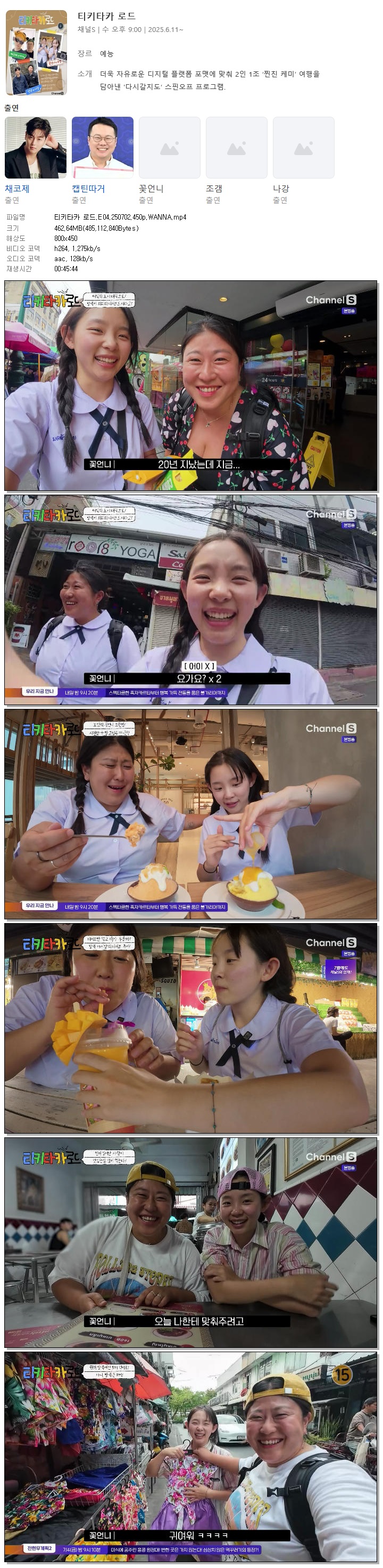| [채널S] 티키타카 로드.E04.250702.450p.WANNA.mp4 | 462.6 M | 00:45:44 | 800x450 |
