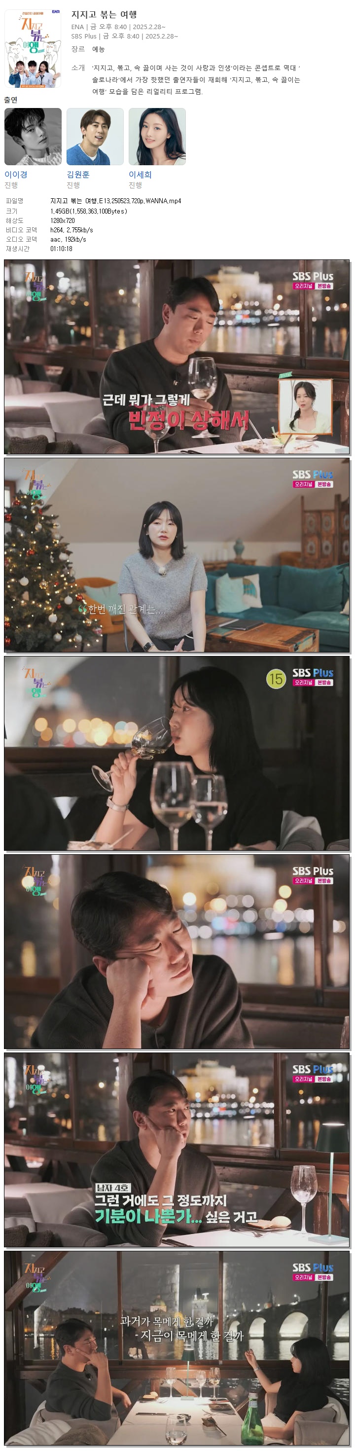 | [SBS PLUS] 지지고 볶는 여행.E13.250523.720p.WANNA[신동, 경수진].mp4 | 1.5 G | 01:10:18 | 1280x720 |