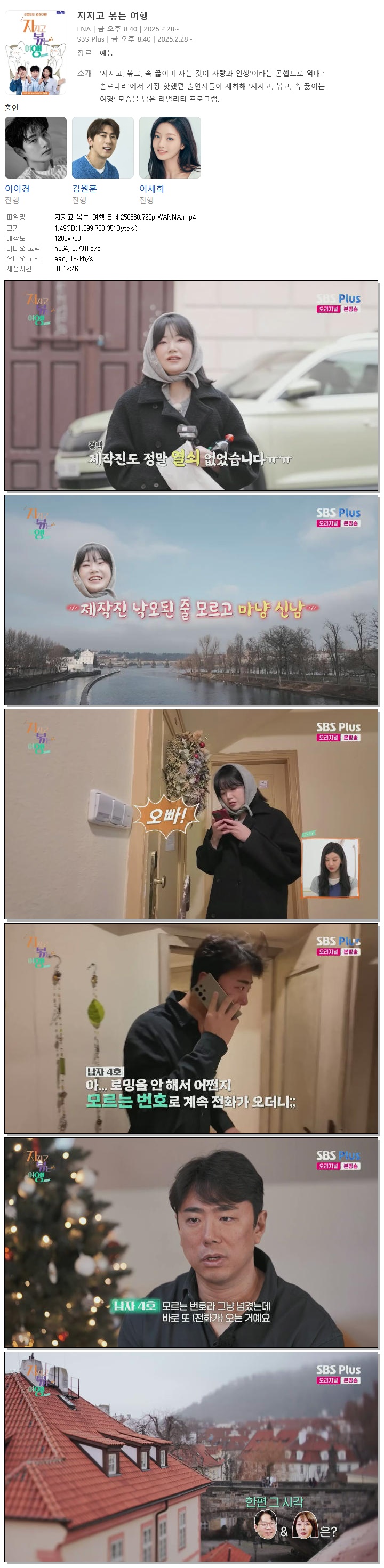 | [SBS PLUS] 지지고 볶는 여행.E14.250530.720p.WANNA[신동, 경수진].mp4 | 1.5 G | 01:12:46 | 1280x720 |