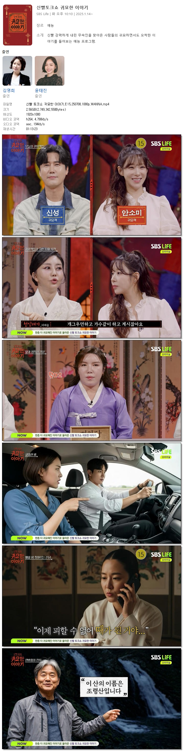 [SBS LIFE] 신빨 토크쇼 귀묘한 이야기.E15.250708.1080p.WANNA[김영희, 윤태진].mp4 2.6 G 01:13:23 1920x1080
