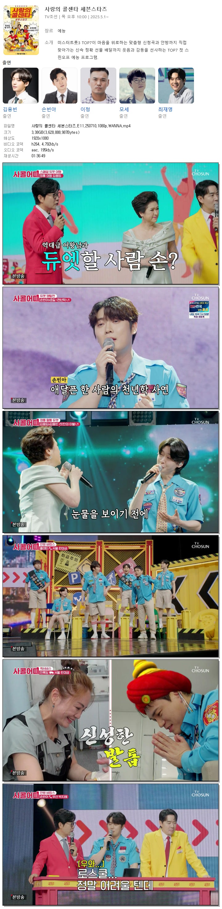 | [TV조선] 사랑의 콜센타 세븐스타즈.E11.250710.1080p.WANNA[김용빈, 손빈아].mp4 | 3.4 G | 01:36:49 | 1920x1080 |