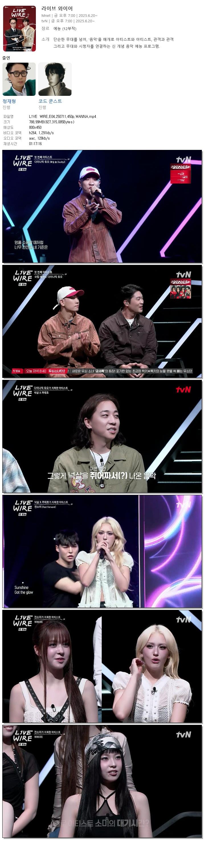 | [TVN] L1VE WIRE.E04.250711.450p.WANNA[다이나믹듀오, 전소미].mp4 | 789 M | 01:17:16 | 800x450 |