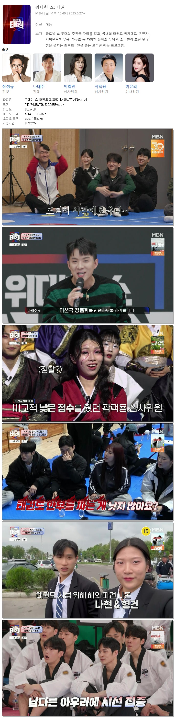 | [MBN] 위대한 쇼 태권.E03.250711.450p.WANNA[장성규, 나태주].mp4 | 740.7 M | 01:12:45 | 800x450 |