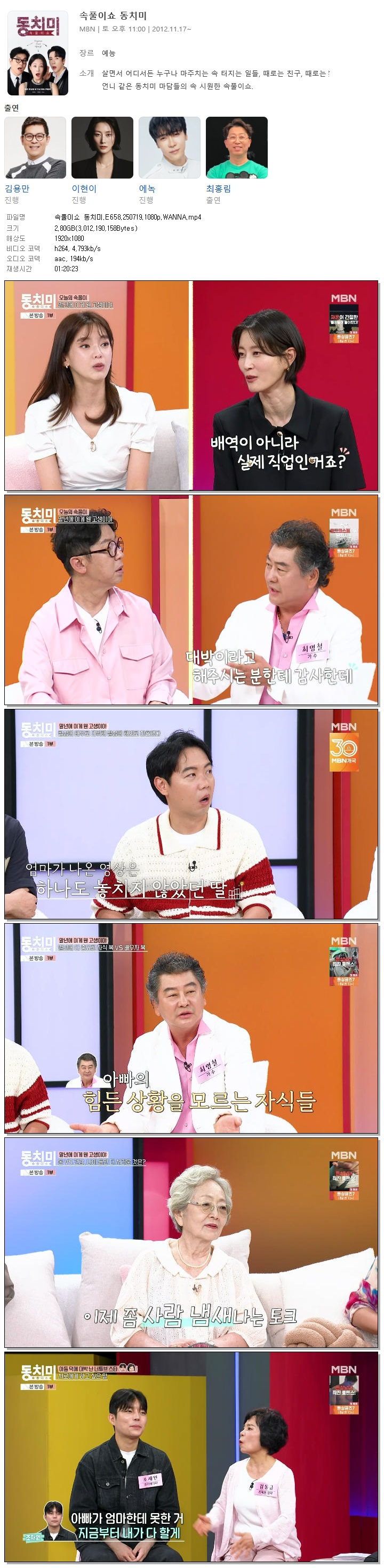 | [MBN] 속풀이쇼 동치미.E658.250719.1080p.WANNA[송광자, 황현희].mp4 | 2.8 G | 01:20:23 | 1920x1080 |
