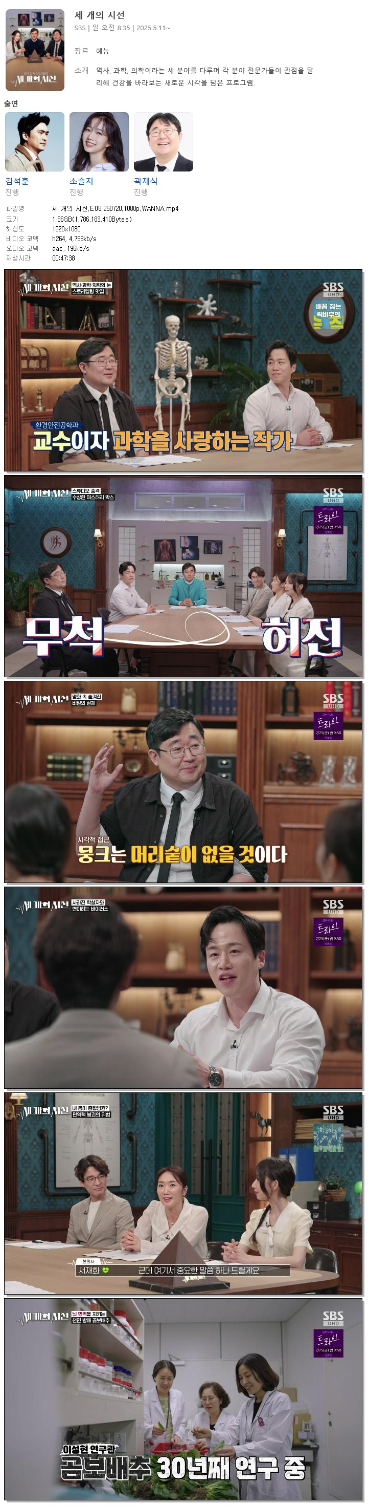 | [SBS] 세 개의 시선.E08.250720.1080p.WANNA[김석훈, 소슬지].mp4 | 1.7 G | 00:47:38 | 1920x1080 |