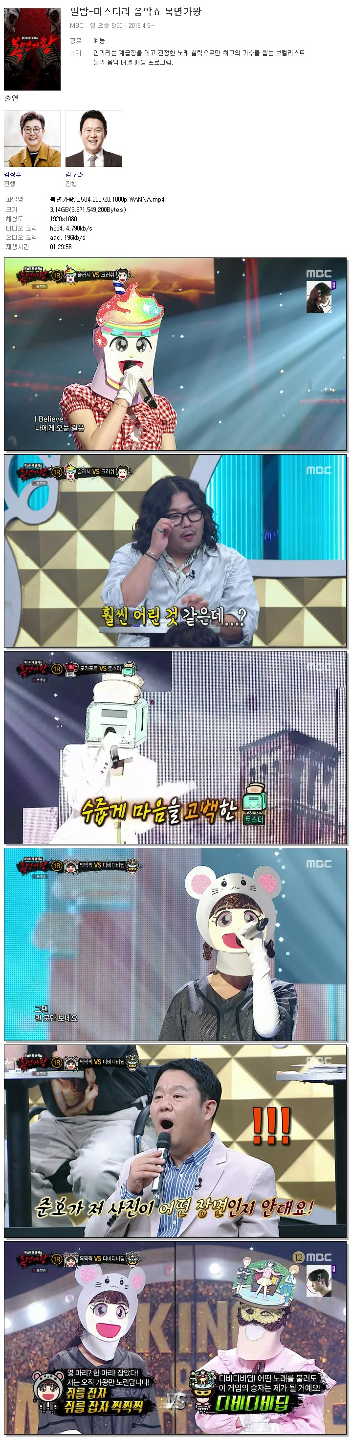 | [MBC] 복면가왕.E504.250720.1080p.WANNA[김구라, 손승연].mp4 | 3.1 G | 01:29:58 | 1920x1080 |
