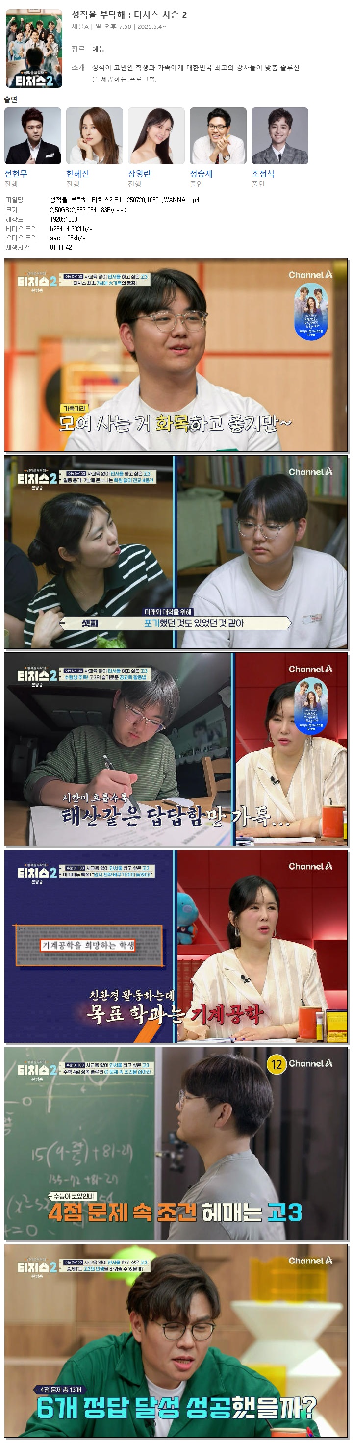 | [채널A] 성적을 부탁해 티처스2.E11.250720.1080p.WANNA[전현무, 한혜진].mp4 | 2.5 G | 01:11:42 | 1920x1080 |