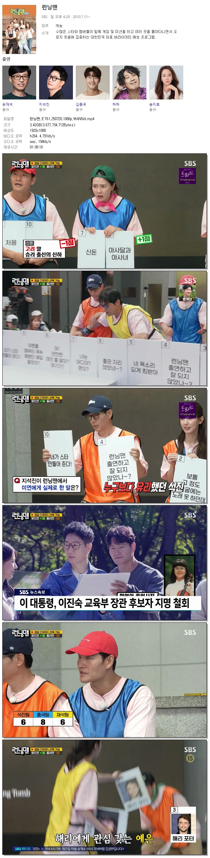 | [SBS] 런닝맨.E761.250720.1080p.WANNA[지예은, 양세찬].mp4 | 3.4 G | 01:38:10 | 1920x1080 |