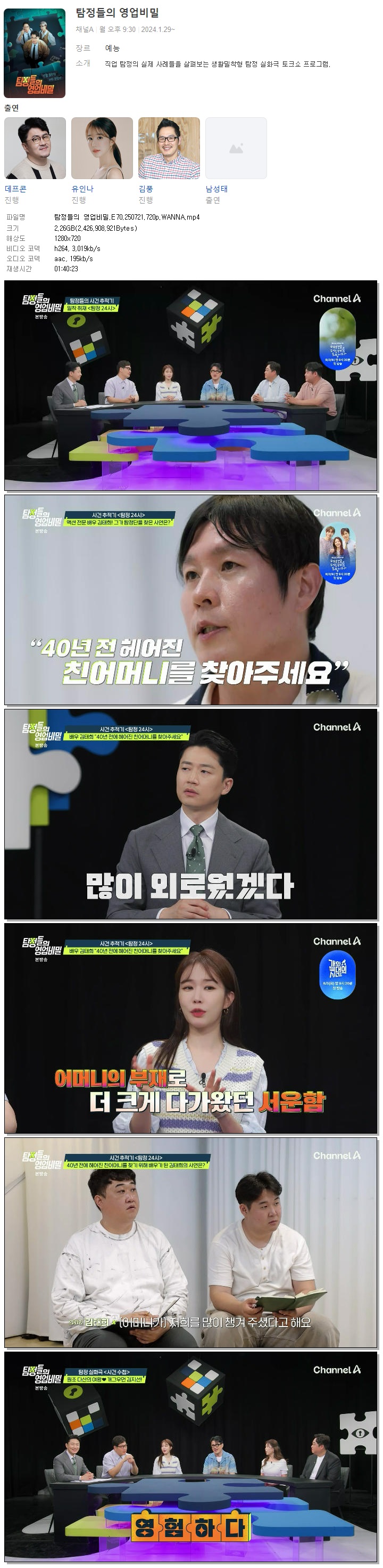 | [채널A] 탐정들의 영업비밀.E70.250721.720p.WANNA[김지선].mp4 | 2.3 G | 01:40:23 | 1280x720 |