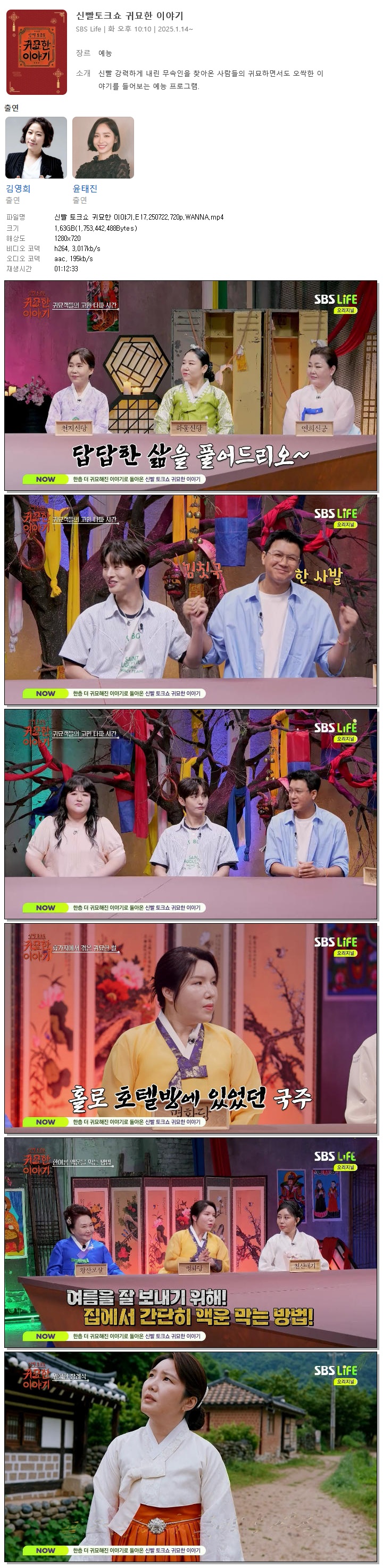 | [SBS LIFE] 신빨 토크쇼 귀묘한 이야기.E17.250722.720p.WANNA[김영희, 윤태진].mp4 | 1.6 G | 01:12:33 | 1280x720 |