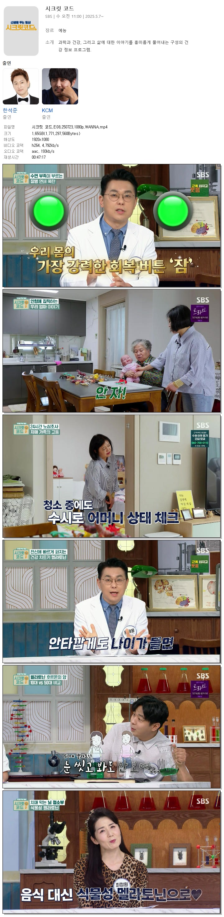 | [SBS] 시크릿 코드.E08.250723.1080p.WANNA[한석준, KCM].mp4 | 1.6 G | 00:47:17 | 1920x1080 |