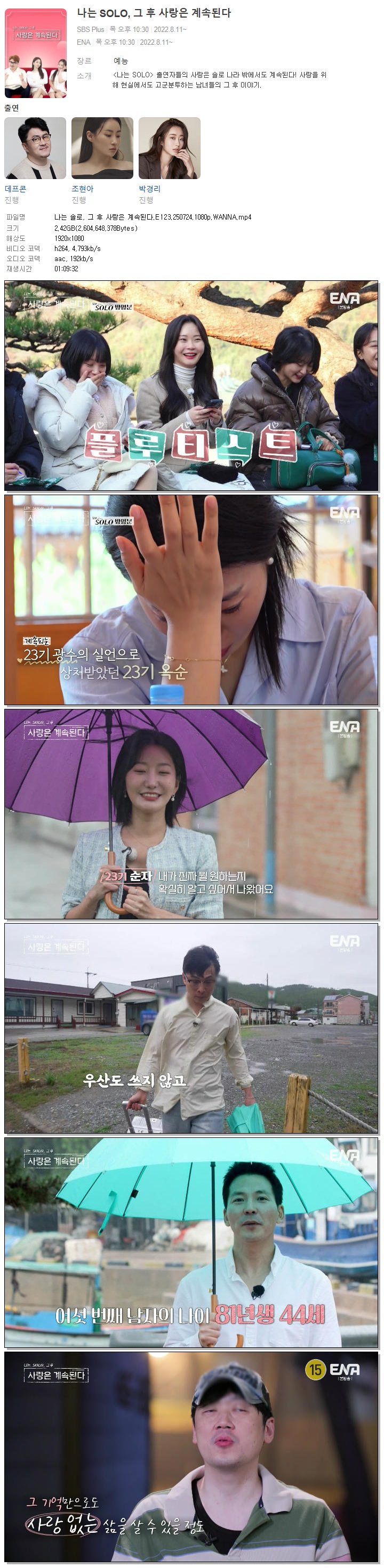 | [ENA] 나는 솔로, 그 후 사랑은 계속된다.E123.250724.1080p.WANNA[경리, 보미].mp4 | 2.4 G | 01:09:32 | 1920x1080 |