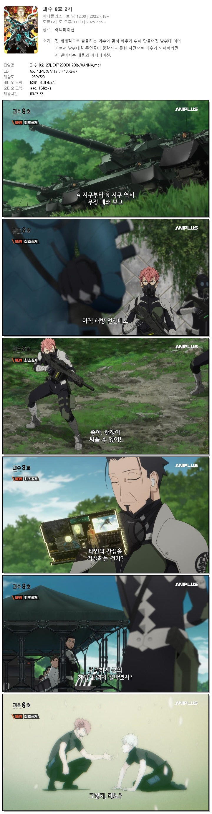 | 괴수 8호 2기.E07.250831.720p.WANNA.mp4 | 550.4 M | 00:23:53 | 1280x720 |