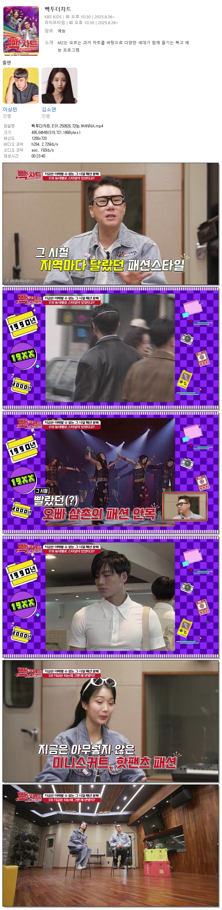 | 빽투더차트.E01.250826.720p.WANNA.mp4 | 495.6 M | 00:23:40 | 1280x720 |