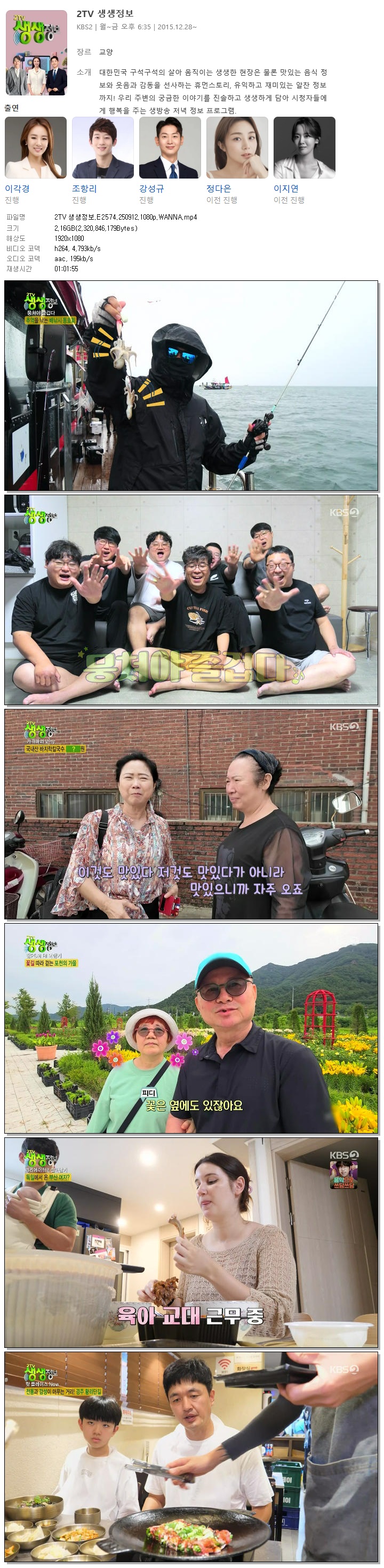| [KBS2] 2TV 생생정보.E2574.250912.1080p.WANNA[이각경, 조항리].mp4 | 2.2 G | 01:01:55 | 1920x1080 |