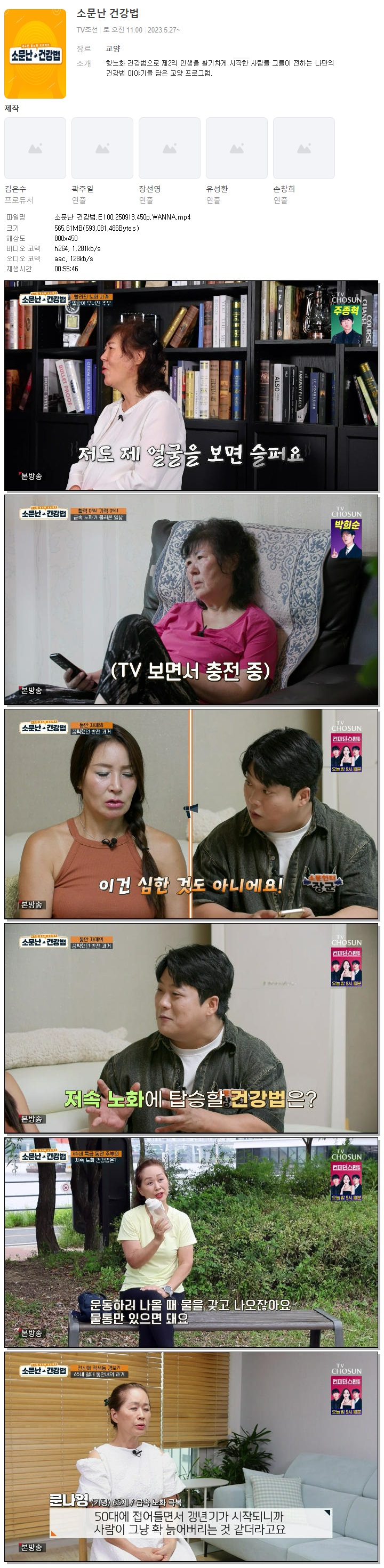 | [TV조선] 소문난 건강법.E100.250913.450p.WANNA.mp4 | 565.6 M | 00:55:46 | 800x450 |