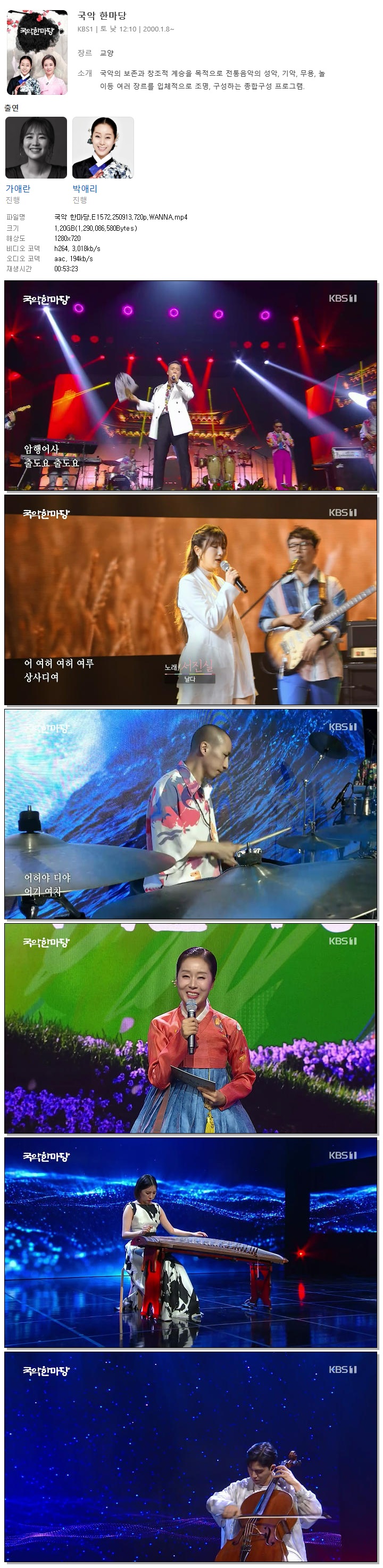 | [KBS1] 국악 한마당.E1572.250913.720p.WANNA[박애리].mp4 | 1.2 G | 00:53:23 | 1280x720 |