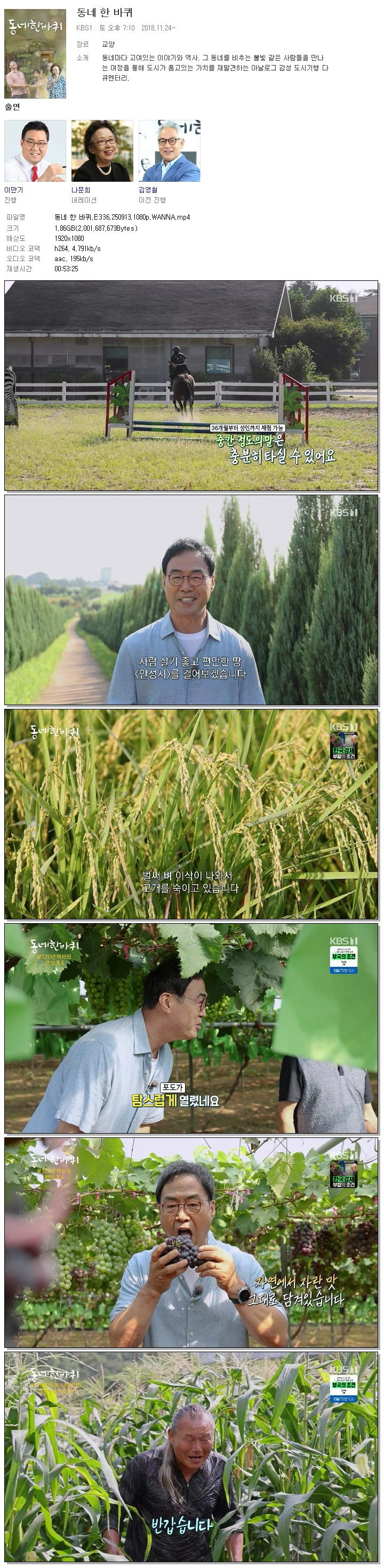 | [KBS1] 동네 한 바퀴.E336.250913.1080p.WANNA[이만기].mp4 | 1.9 G | 00:53:25 | 1920x1080 |