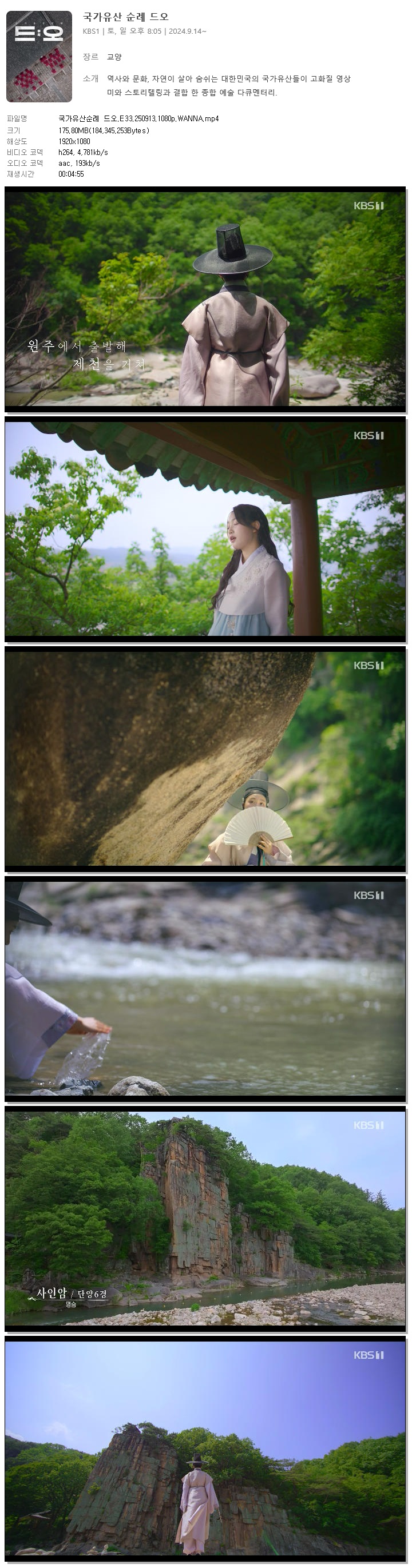 | [KBS1] 국가유산순례 드오.E33.250913.1080p.WANNA.mp4 | 175.8 M | 00:04:55 | 1920x1080 |