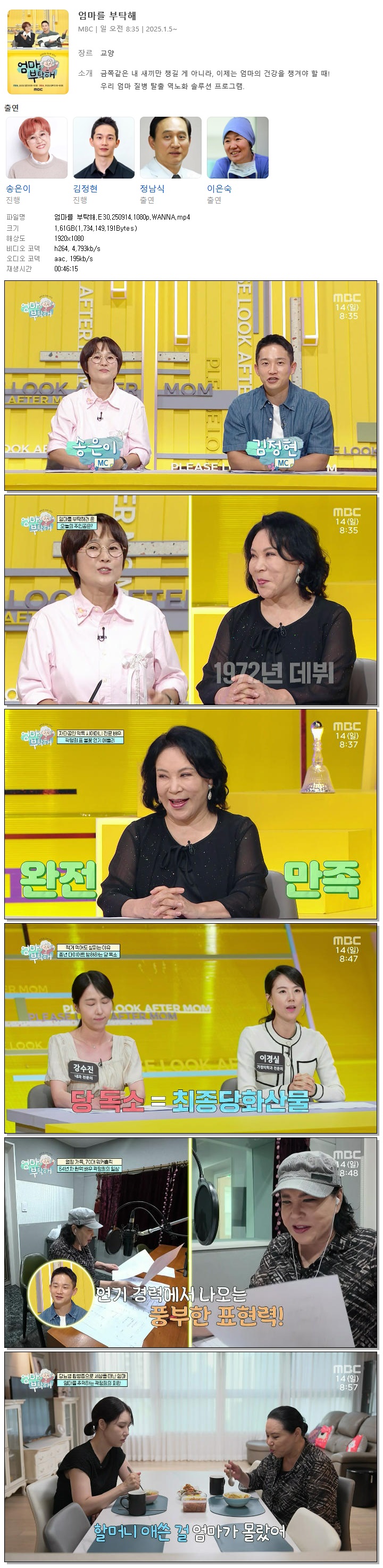 | [MBC] 엄마를 부탁해.E30.250914.1080p.WANNA[송은이, 김정현].mp4 | 1.6 G | 00:46:15 | 1920x1080 |