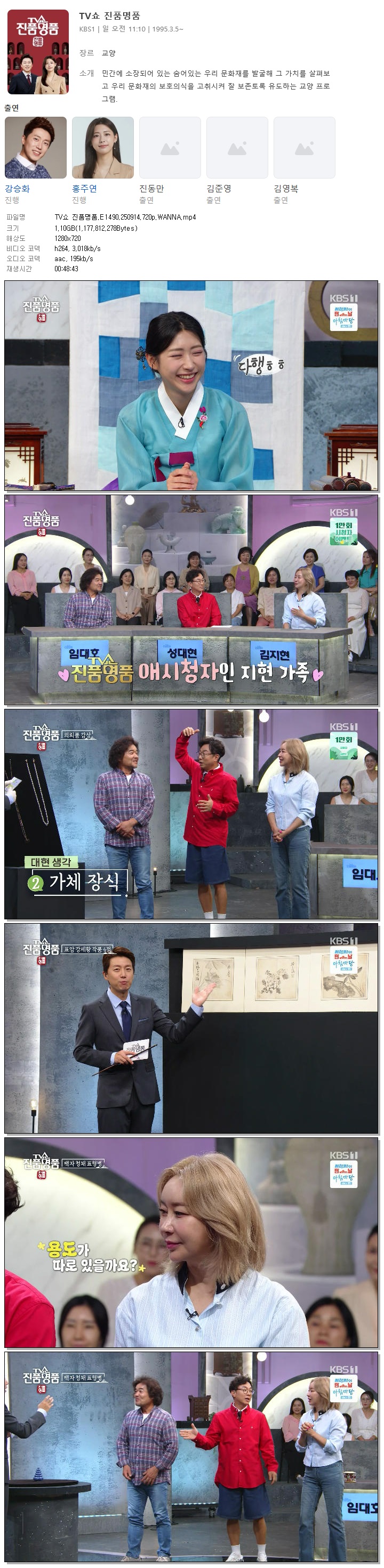 [KBS1] TV쇼 진품명품.E1490.250914.720p.WANNA[강승화, 진동만].mp4 1.1 G 00:48:43 1280x720