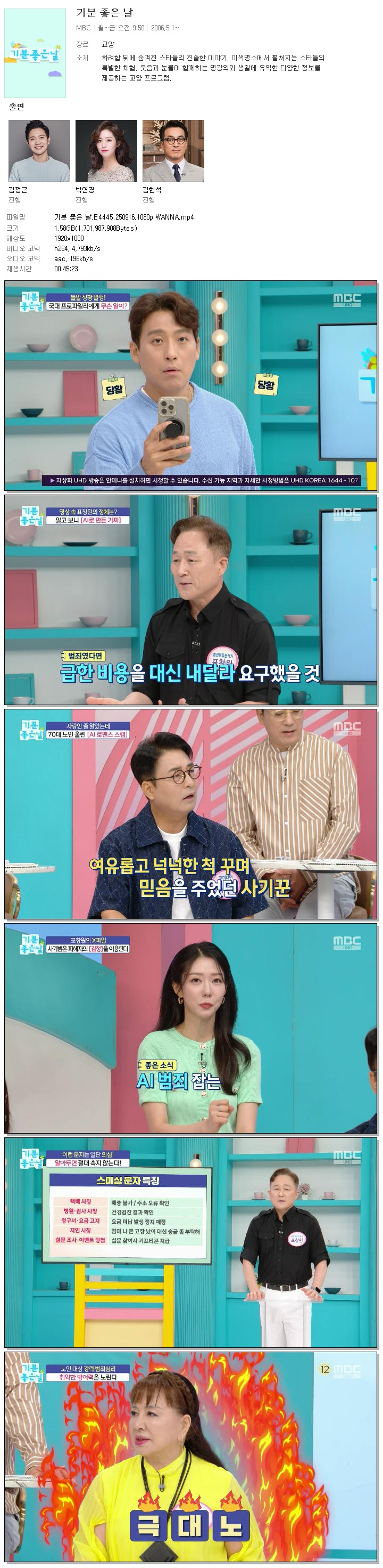 | [MBC] 기분 좋은 날.E4445.250916.1080p.WANNA[서인, 박연경].mp4 | 1.6 G | 00:45:23 | 1920x1080 |