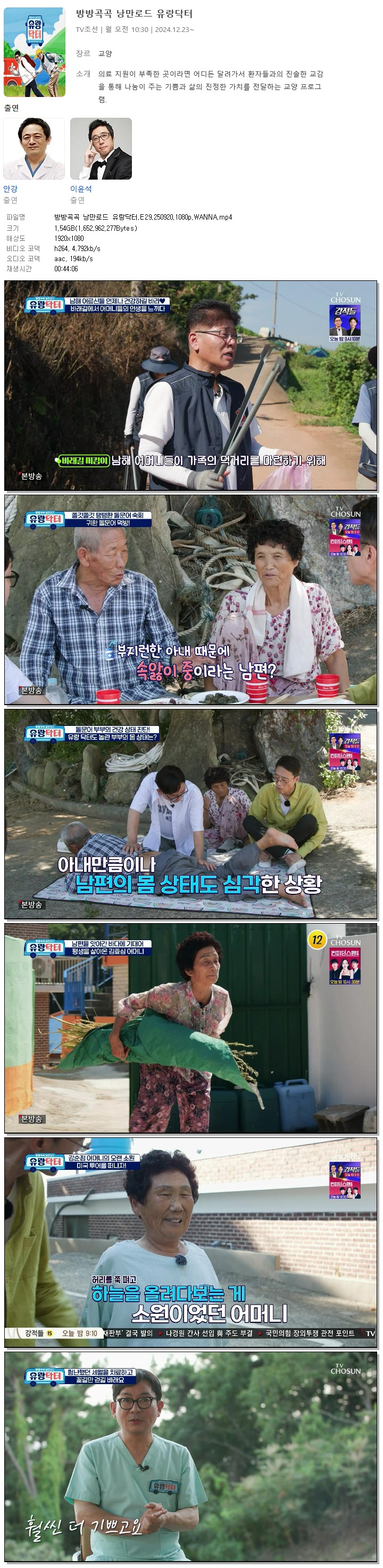 | [TV조선] 방방곡곡 낭만로드 유랑닥터.E29.250920.1080p.WANNA[안강, 이윤석].mp4 | 1.5 G | 00:44:06 | 1920x1080 |