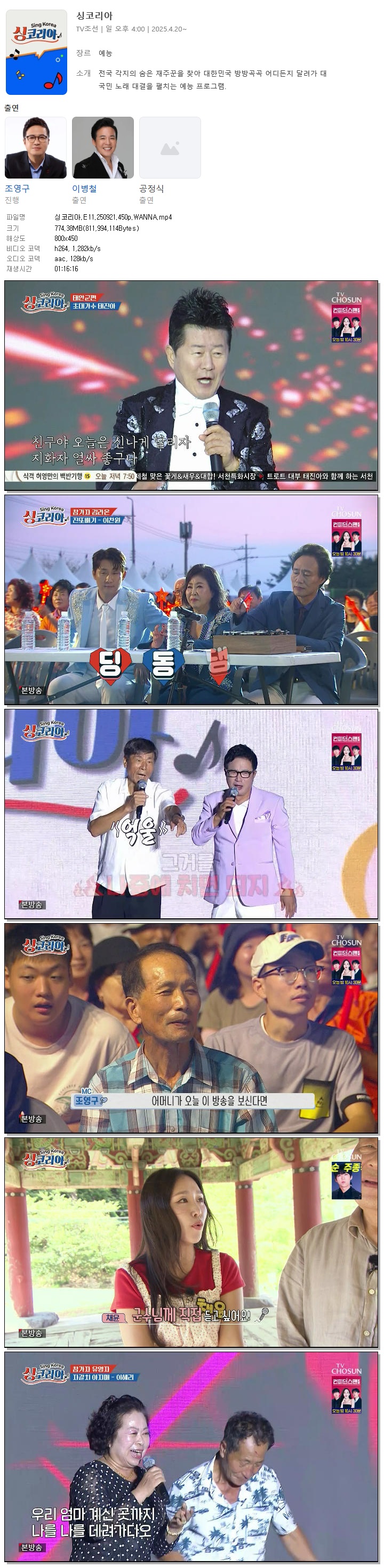 | [TV조선] 싱코리아.E11.250921.450p.WANNA[조영구].mp4 | 774.4 M | 01:16:16 | 800x450 |
