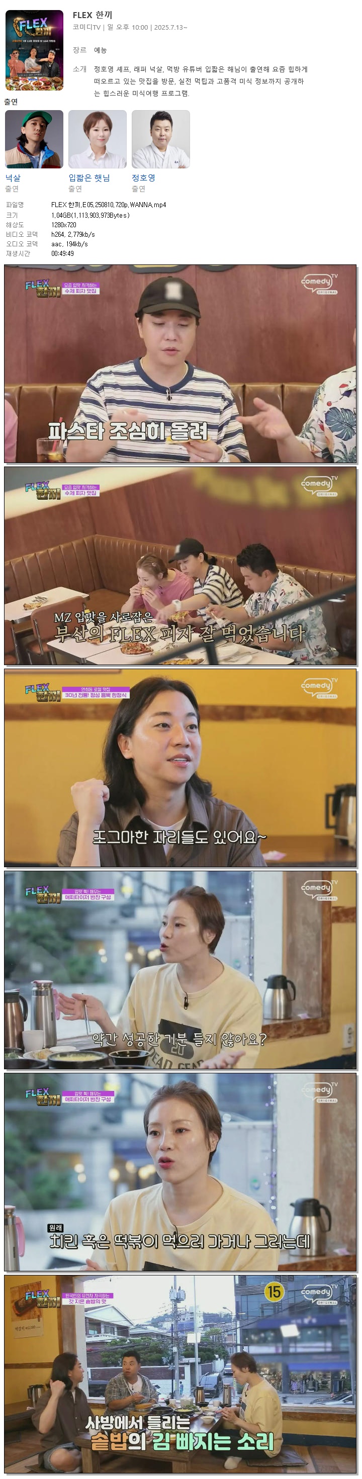 | FLEX 한끼.E05.250810.720p.WANNA.mp4 | 1 G | 00:49:49 | 1280x720 |
