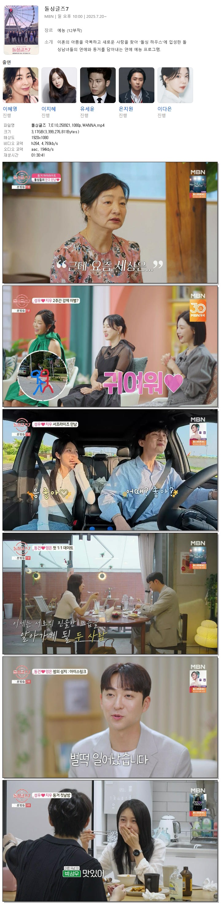 | [MBN] 돌싱글즈 7.E10.250921.1080p.WANNA[이혜영, 이지혜].mp4 | 3.2 G | 01:30:41 | 1920x1080 |