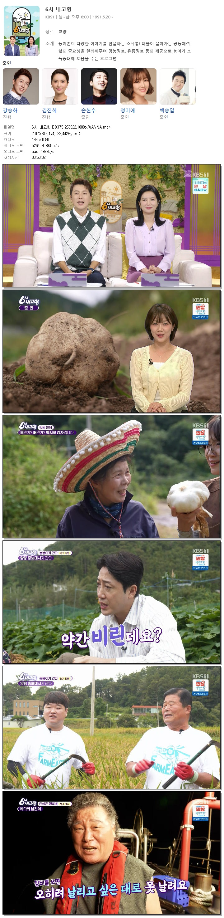 | [KBS1] 6시 내고향.E8375.250922.1080p.WANNA[강승화, 김진희].mp4 | 2 G | 00:58:02 | 1920x1080 |