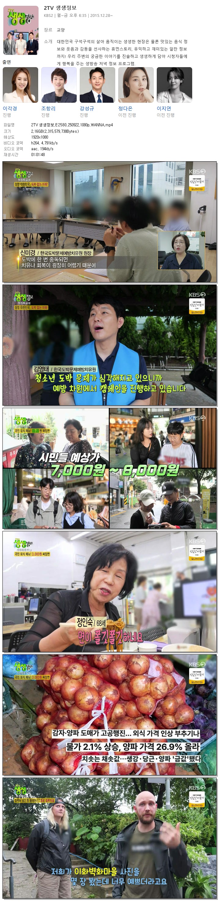 | [KBS2] 2TV 생생정보.E2580.250922.1080p.WANNA[이각경, 조항리].mp4 | 2.2 G | 01:01:48 | 1920x1080 |