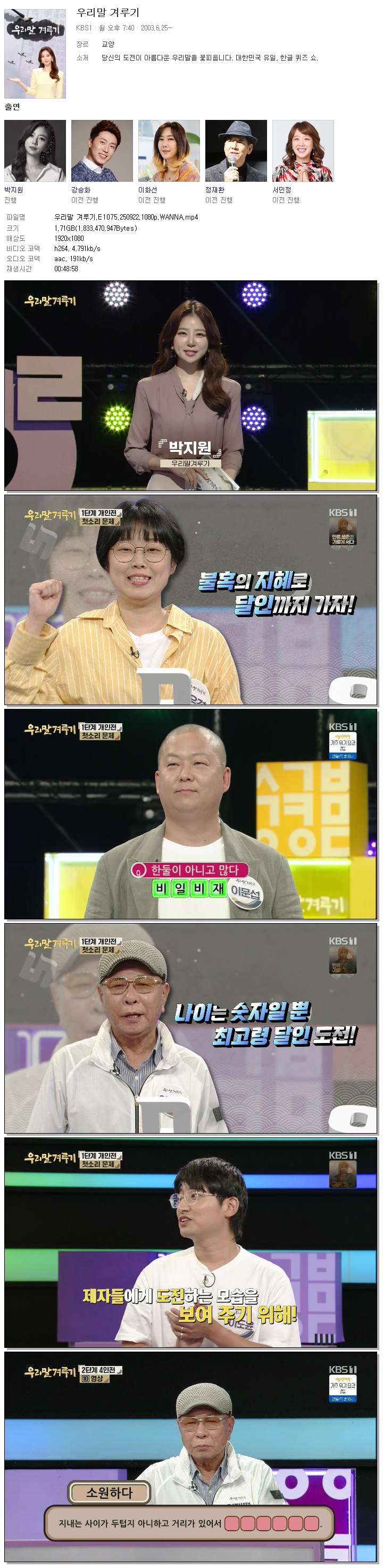| [KBS1] 우리말 겨루기.E1075.250922.1080p.WANNA[박지원].mp4 | 1.7 G | 00:48:58 | 1920x1080 |
