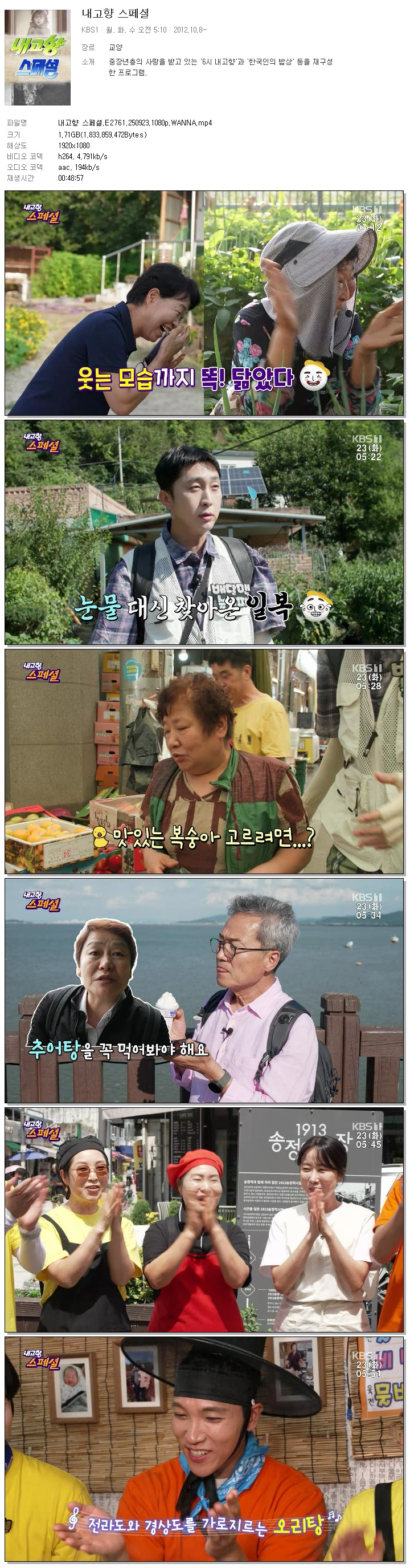 | [KBS1] 내고향 스페셜.E2761.250923.1080p.WANNA.mp4 | 1.7 G | 00:48:57 | 1920x1080 |